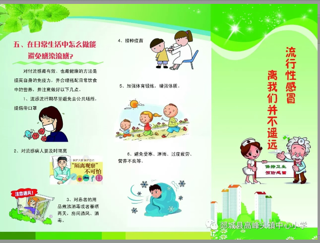 每年12月到次年2月是流感流行的高峰期,今年我省流行的主要是乙(B)型流感病毒,为提高学生健康意识,远离流感病毒。现在跟大家分享一下流行性感冒的预防措施: