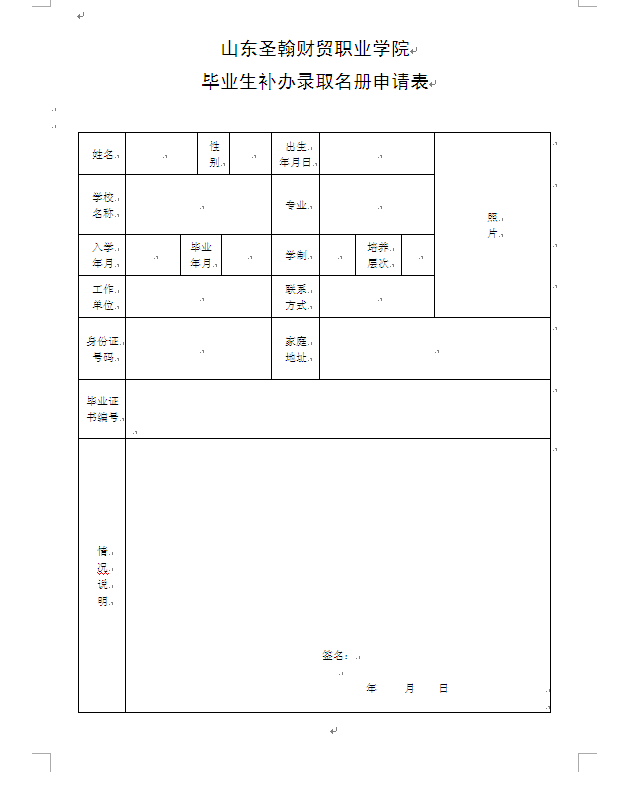 一、录取名册补办准备材料: 1、填写《山东圣翰财贸职业学院毕业生补办录取名册申请表》(手写)。 2、身份证原件、身份证复印件1份。 3、二寸蓝底彩色照片1张。 二、学校不接收邮寄材料,请本人或找他人代为办理。他人代办准备材料: 1、上述第一部分所有材料; 2、委托书; 3、被委托人身份证复印件。 三、录取名册补办流程 1、学籍管理科:提交材料,查找录取名册并复印; 2、学校办公室:录取名册上盖学校公章。