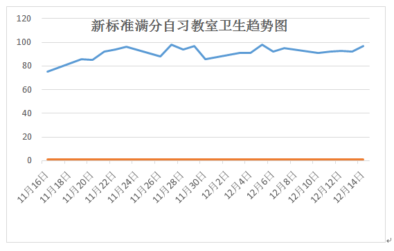 在新标准执行一个月后,自习教室卫生总体变化情况有:(1)满分卫生占比从开始时的最低76%到七天之后的最高99%;(2)进入12月份后,满分卫生占比高于90%,平均94%。(如下图所示)