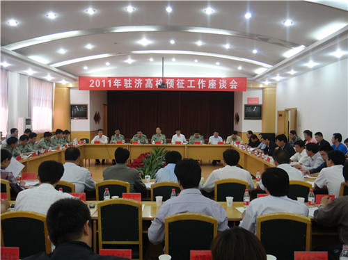 5月23日下午14:30,济南警备区召开了“2011年驻济高校预征工作座谈会”,省军区副参谋长鞠洪仑,中共济南市委常委、济南警备区政委晋争鸣,济南市副市长齐建忠,济南警备区参谋长许胜廷,省教育厅、济南市教育局以及各县(市、区)分管领导、人武部部长,驻济41所高校负责人参加了会议。会议由济南警备区司令员胡少平主持。