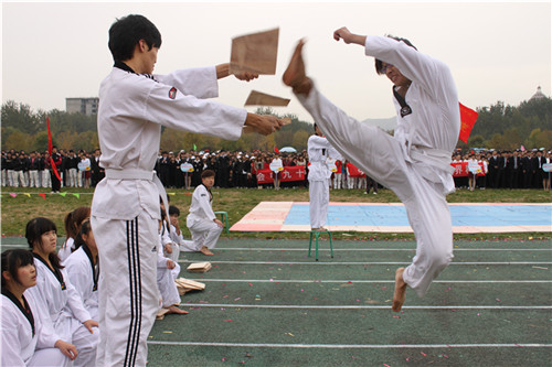 随后的跆拳道表演,同学们通过品势、搏击、击破三个环节为在场领导、师生奉献了一场精美绝伦的视觉盛宴,跆拳道教练陈仲博一掌击破八块大理石把全场的气氛推向了高潮。