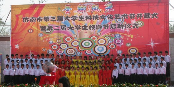2011年4月20日上午9点30,济南市第三届大学生科技文化艺术节在国际园博园和谐广场隆重开幕,本次活动是经共青团济南市委、济南市教育局、济南市学生联合会决定举办的,将持续三个月,由各驻济高校承办的各项学生文体及学术竞赛活动组成。我校承办艺术节开幕式,4000余名师生共同参与,现场气氛热烈非凡。