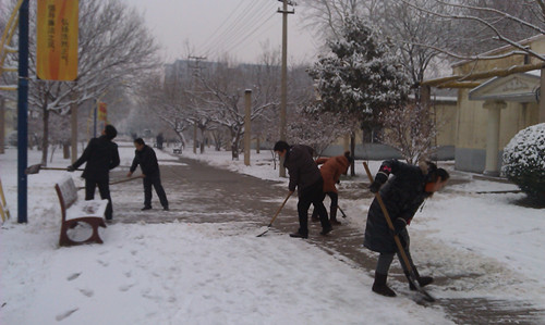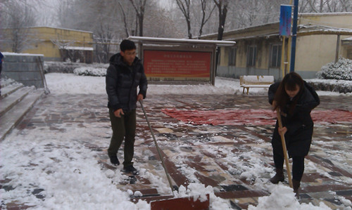 12月21日上午9:00,辇玉杰院长带领学院无课的部分教职员工,来到教学楼前主干道前,与学校设备科的老师们开展了集中扫雪活动。经过一个小时的清扫,教学楼主干道露出了原来的面貌,有效保证了学生的校园出行方便。