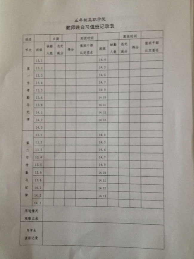 为加强学院晚自习管理,营造良好的学习气氛,学院制定晚自习检查及赋分制度。学院晚自习检查由学院领导巡查、值班教师和学生会检查组成。检查人员需如实认真填写检查表,并于第二天及时反馈给学院团委负责人,检查结果每日公布,每月排名。