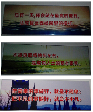 校园文化是一个不断建设、反思、提高的整体工程,是学校可持续发展的动力,是学校综合办学水平的重要体现,也是学校个性魅力与办学特色的体现,更是学校培养适应时代要求的高素质人才的内在需要。为了进一步优化育人环境,切实落实县教育局年初下达的各项工作任务,强化我校教育管理水平,营造良好的育人氛围,提升学校的办学品位,我院以“学践科学发展,构建和谐校园”为统领,全面贯彻教育方针,不断深化课程改革,以中华民族的优良传统和社会主义荣辱观为导向,以优化、美化、净化校园文化环境为重点,促进学生健康成长和教师的专业成长,为学校的可持续发展奠定基础。在每一个走廊里都挂有标语,如下图所示。引导学生有一个积极向上的心态,让学生有一个明确的目标,在如此氛围下学生的上课秩序和质量都有明显改善和提升。下图中可以看出学生在课堂上积极上课的表现。