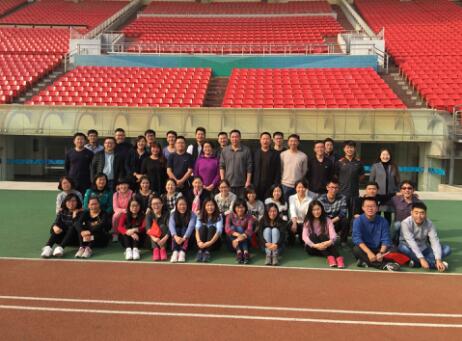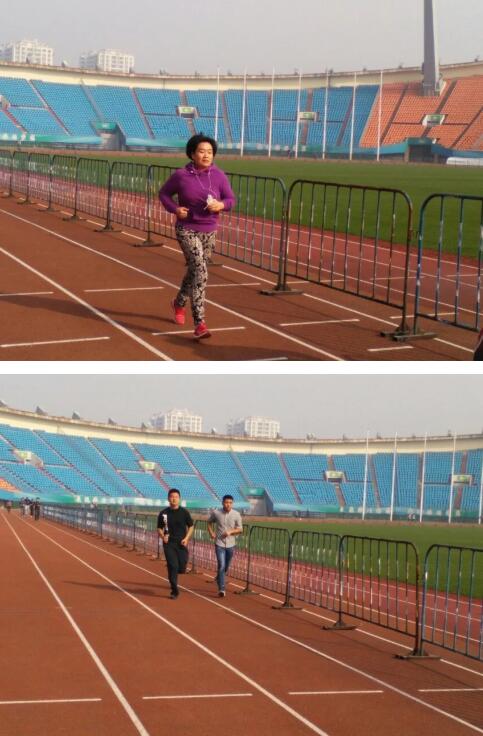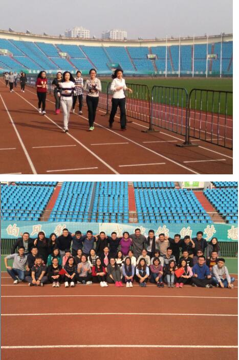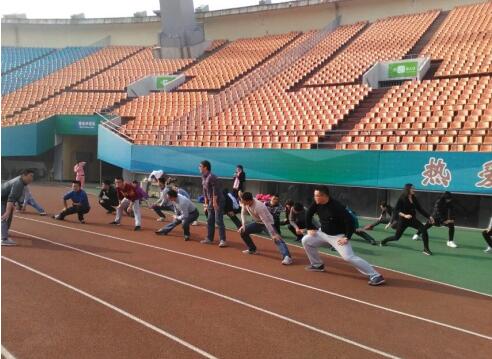 10点,所有五年高职学院教职工在省体育中心操场集合,大家全部运动装、运动鞋,一个一个精神抖擞好似运动健将。首先,在黄院长的带领下,大家先进行了跑步前拉伸等热身活动。
