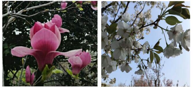 几场淅淅沥沥的春雨过后,给春天的圣翰更增添了勃勃生机,槭树枝头一片绿意盎然. 远远的,清风夹着一缕淡淡幽香扑鼻而来,循香而望,绿叶掩映的主路左侧上空,点点白色、粉色闯入了我的眼帘,是那样的美丽娇艳,那样淡雅,在一片绿色橡树的衬托下清丽而脱俗,我不由地止住了脚步,雨后的花儿沾着露珠,更加楚楚动人,几位女学生簇拥着欢笑着禁不住驻足拍下最美的笑脸……