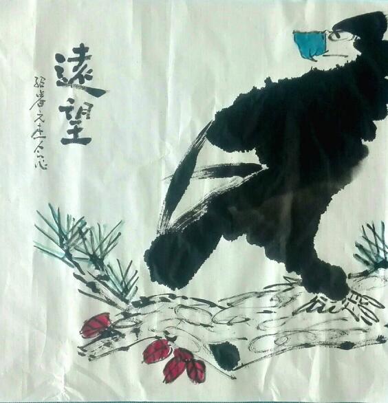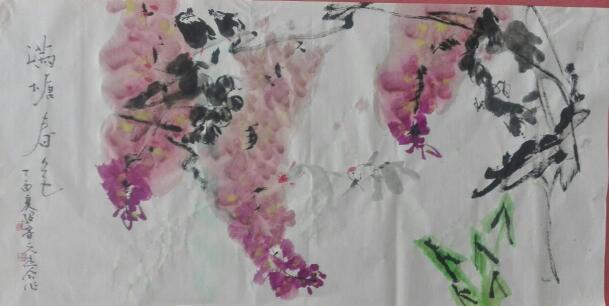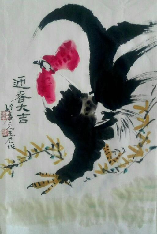 其次,韩绍睿同学现场泼墨作一四尺大画《满塘春色》,笔法娴熟,画面生动,情趣盎然,引起山传同学的围观与讨论,也受到了该校领导的连连称赞。又作《远瞩》、《迎春大吉》,印刻“韩”字印章一枚,赠送给了现场的同学。