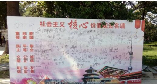 “富强、民主、文明、和谐、自由、平等、公正、法治、爱国、敬业、诚信、友善”,这十八个字是我国社会主义核心价值观的浓缩,主要是从国家的层面,社会的层面和个人的层面对我们提出的价值观要求。山东省翰财贸学院对全体学生进行社会主义核心价值观签名墙的行为,就是将这一价值观念深入学生的学习与生活的方方面面。这样帮助同学们做到爱国家,爱社会,爱学校,爱家人,爱朋友,做到与人为善。这也是与学校一直坚持的对学生进行国学教育相辅相成。