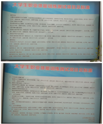 山东圣翰圣翰财贸职业学院为此设置了大学生职业体能训练测试项目,例如:翻转轮胎、s型平衡木通过测试、翻越障碍以及与我们建筑相关的直线型梯子通过测试。像建筑这一行业,是需要大量的耐力与力量,需要发展肩带和下肢肌肉、前庭稳定性、静力耐力、灵敏性以及在高空和有限地点爬楼梯、爬杆、爬绳和跳跃时保持平衡的能力。训练中应适当加强沿纵放、横放、斜放的梯上作攀爬训练、头手倒立和手倒立、肋木训练和爬绳训练、窄木行走、在不高处跳下训练负重和对抗训练等。