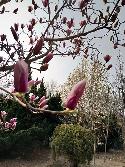 站在学校门口往东看,府邸前的两树白玉兰早就开起了白色的花儿,再往东,穿过一片林子,可以看到老办公楼前的红玉兰和白玉兰交相辉映,真是美极了。沿着主路接着走,路边也是三三两两的红玉兰和白玉兰,就这样边走边观赏,走着走着,到了值班室门口,一大片的玉兰花在这开阔的空间里开着,给学校带来了早春的诗意,实训室门口也有玉兰花,操场也有玉兰花,红白相间的玉兰花是这个季节学校最美的风景!