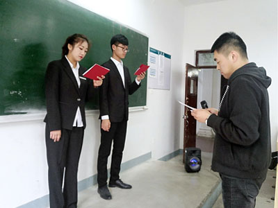 俗话说:“台上十分钟,台下十年功”。为助力合唱比赛,呈现完美比赛效果。五年制高职学院合唱比赛的两位主持人——杨世娇、彭浩然同学,利用课余时间,加强训练,提高功力。他们深知通过专业的训练才能达到较高的语言表达水平,故特邀请毕业于播音表演专业的胡正老师为他们指导训练。