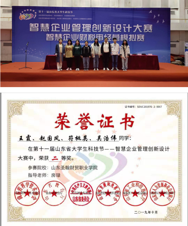 近日,在山东省科学技术协会、山东省教育厅、省团委、省发改委多部门组织的第十一届大学生科技节----智慧企业管理创新设计大赛中。由五年制高职学院房琭老师指导的王霞、赵国凤、符桃英、吴浩伟四名同学在在企业财税审(高职组)分赛项喜获二等奖一项,在企业财务共享中心设计(高职组)分赛项比赛中喜获三等奖一项;程秀芬、杨月、王可心、张登旭四名同学在企业财税审(中职组)分赛项喜获三等奖一项。