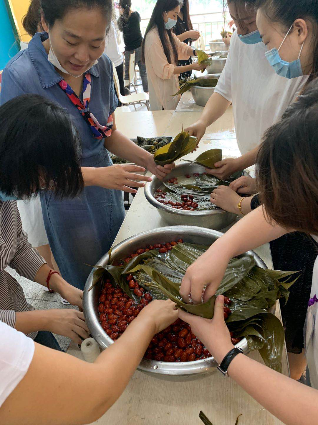 折叶、盛料、压实、裹叶、扎绳…我们邀请食堂阿姨现场教老师们包粽子。在包粽子的过程中,大家互相交流,互相学习,不会包的老师拿着粽叶一步一步的跟着会包的老师学习,虽然包的不太好,但是看着自己亲手包好的粽子很是欣喜。参加活动的老师们纷纷表示:包粽子、吃粽子,一直是我们中国的传统习俗,这个活动不仅使我们感受到了浓浓的传统文化氛围,而且也使大家在互帮互助的包粽子过程中,增进了教师间的友情,更拉近了彼此间的距离。