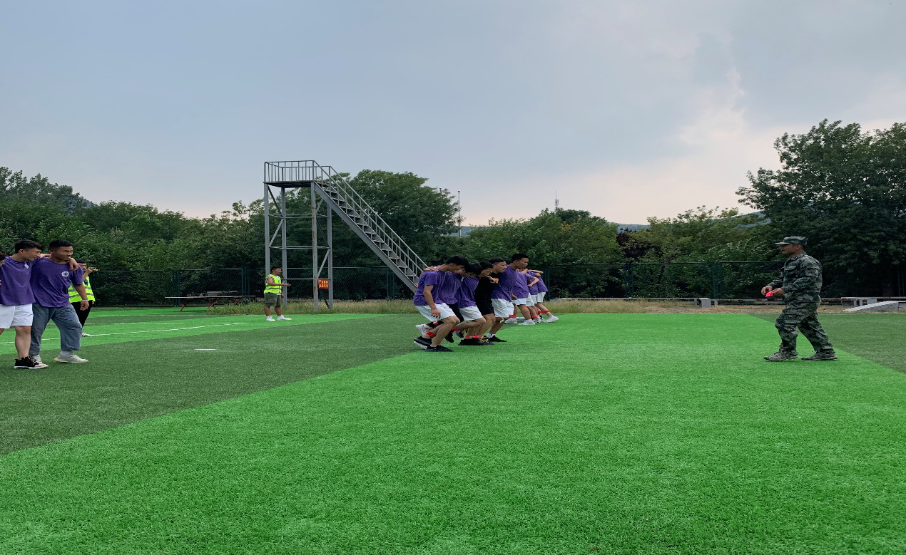 人生如赛场,路途似跑道。在这秋高气爽的开学季里,在这远离城市喧嚣的操场—活动开始,军训连每连都排出一组人员左腿和另一人右腿绑在一起,三组并排一起站在起跑线上。哨声响起,各队齐出,齐心协力,行进中所有相邻队员两腿自始至终都由绑腿绳绑在一起。