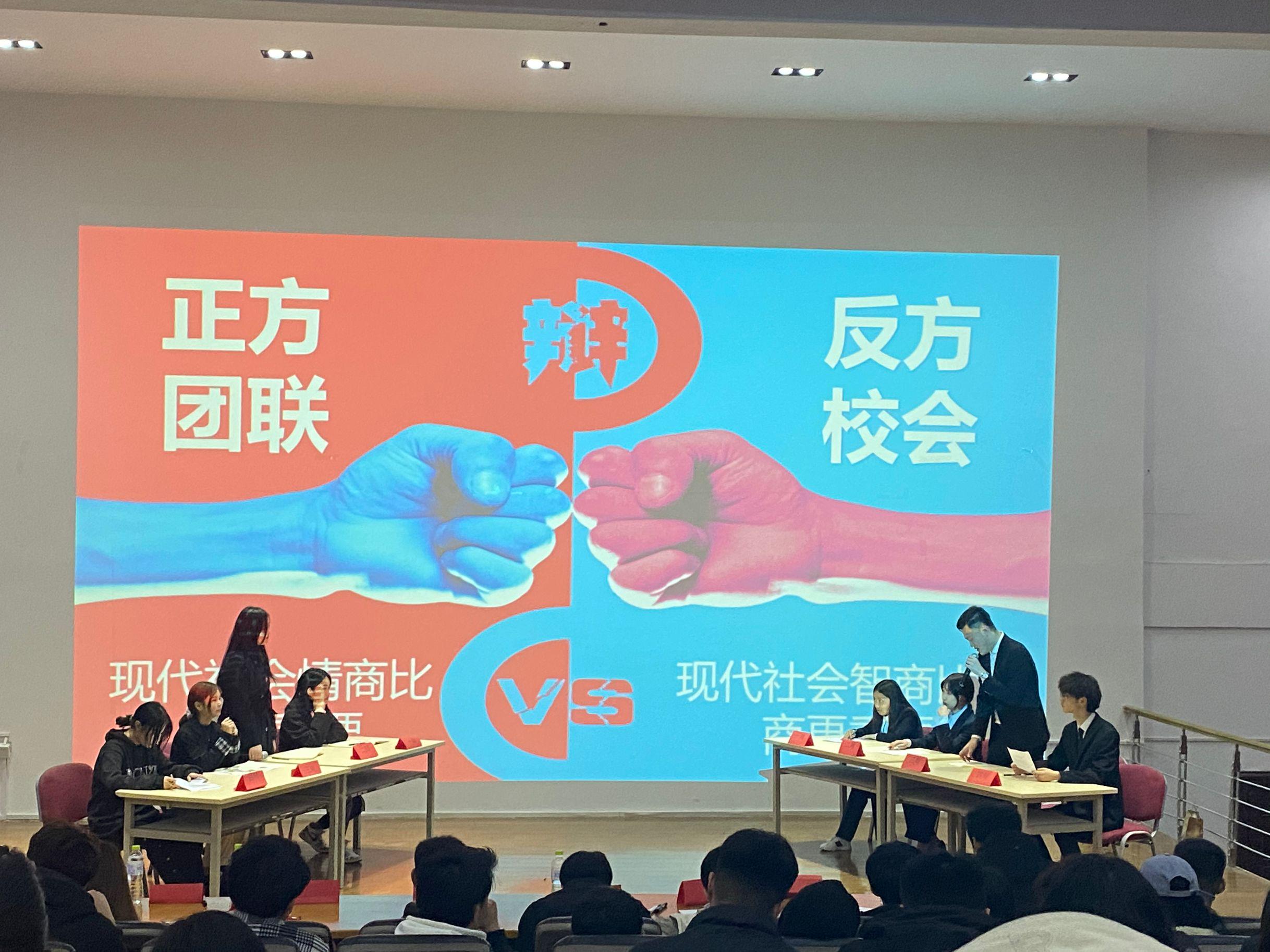 双方辩手在开场立论、对方质询、自由辩论等环节中,思路清晰,一方从容自若,口若悬河,另一方也气定神闲,滔滔不绝。双方互不相让,各据一势,现场气氛一度因双方的妙语连珠而掌声雷动在双方辩手作出具有高度概括性的陈词总结之后,结束了此次比赛。 接着举行了最后一场辩论赛,这是一场压轴之辩,现代社会情商比智商更重要、现代社会智商比情商更重要,正反方辩手清晰的思路和陈词给观众留下了深刻的印象,最终反方取得了胜利。