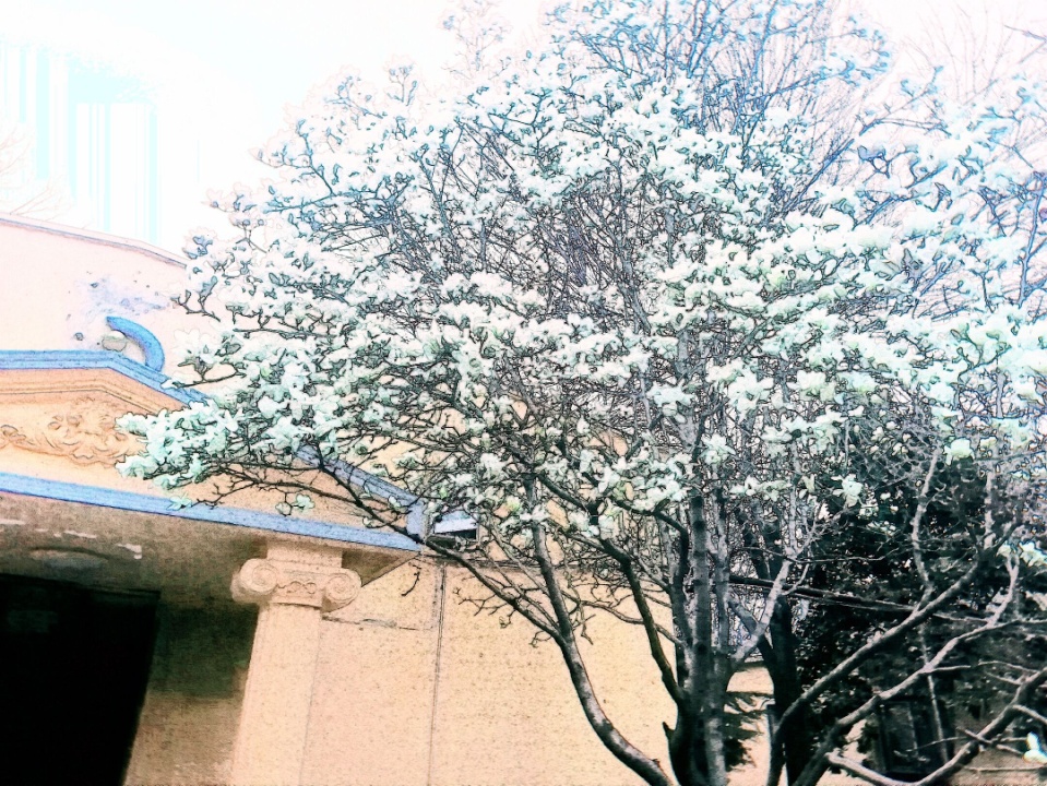 休息时坐在树下的长椅上,举目仰视,蔚蓝的天,洁白的花,自由的风,欢快的鸟,这一切神奇地组成了一幅绝妙的图画。衬在玉兰后面的天空如平静清澈的湖面,洁白的花朵像一群纯洁的天鹅,风在她们前后欢呼,鸟儿为她们伴奏,她们在湖面翩翩起舞。
