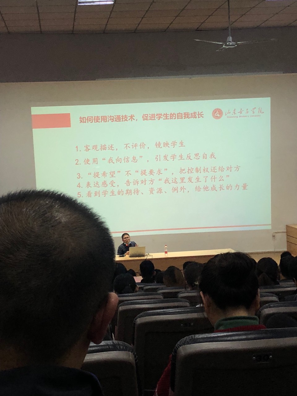 第一报告厅,教授以“使用沟通技术,促进学生自我成长”为讲授主题,为全体教师开展心理健康培训。从心理健康是什么、怎么认识以及如何开展工作三个层面,结合具体案例,提出开展心理健康教育工作的重要性、途径及具体措施,为我校心理健康教育工作的开展提供了宝贵的经验借鉴。教授结合大学生心理发展特点,就同学普遍关注的问题进行分析和讲解,提出很多科学的行之有效的应对建议,就引导学生关注心理健康,增强心理保健意识。精彩的讲授赢得现场老师们的热烈掌声。
