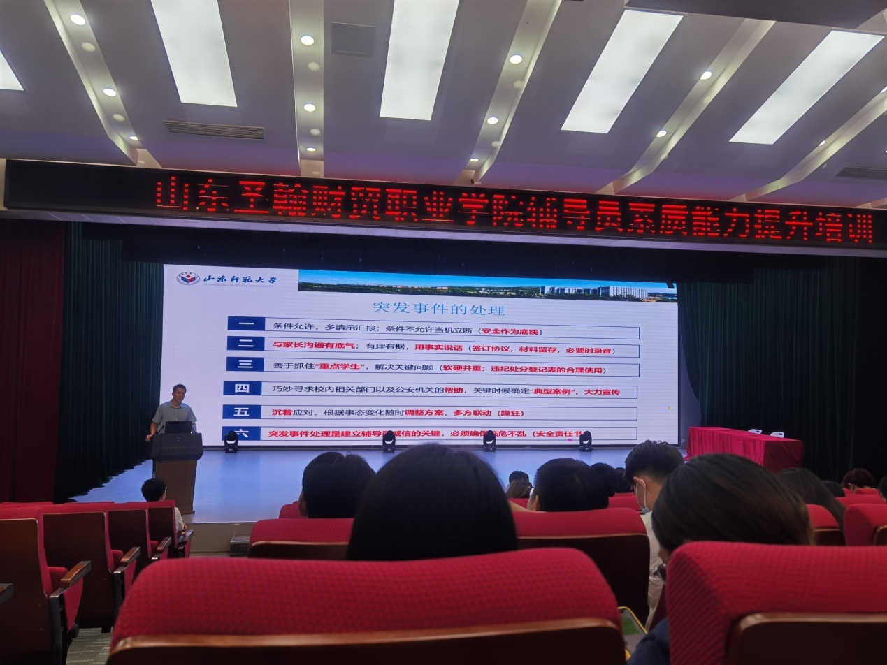 李卫老师分别从学生思想政治工作热点、新《职教法》解读、文化育人、人际沟通、心理健康、辅导员素质能力和育人水平的提升方法、特别学生群体的教育管理等方面作专题讲述。