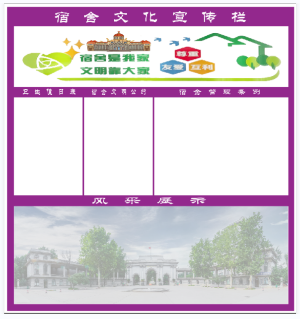 整洁的地面、整齐的被子、温馨的装饰、和谐的氛围在学生寝室中展现的淋漓尽致各个寝室的风格不一,有的装饰的十分喜庆,有的装饰的特别温馨,美丽的壁画等多姿多彩。