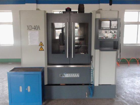 数控铣床型号:XD-40A立式数控铣床,是靠程序控制的自动加工机床,大连机床厂生产,日本FANUC-Oi(发那科)控制系统,三轴联动,主轴标准转速为8000r/min,工作台行程为600*420mm;操作时,将编写好数控加工程序通过机床操作面板输入到机床控制系统中,进行自动加工,可完成平面、沟槽、轮齿、螺纹、花键轴以及比较复杂型面的加工,用于数控专业、机电专业的学生实习操作,以及教师和兴趣小组科研训练使用。