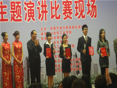 2011年4月27日,济南市地方税务局长清分局主办,山东轻工业学院承办,山东师范、山东中医药、山东圣翰财贸学院等十所专本科院校协办的以“今天的大学生 明天的纳税人 ”为专题的演讲比赛。山东圣翰财贸学院作为唯一一所专科院校参加了此次活动。我校财贸学院冯晶作为代表参加本次活动,并在以税收•发展•民生为主题的演讲活动中,充分展示了一名演讲者应有的素质,感情充沛,语言生动流畅,现在气氛热烈,得到评委老师的一致认可,获得演讲比赛的第三名,为我校增光添彩。