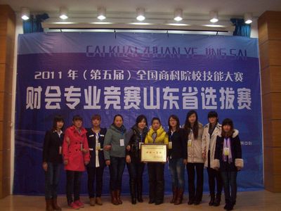 2011年11月20日上午11:00, 第五届全国商科院校技能大赛财会专业竞赛山东省选拔赛圆满落幕,经过31支队伍的激烈角逐,我校财贸学院由学生范雪、元慧萍、胡家蓉组成的财贸学院代表队获得一等奖;由学生岳文娜、王娇、董杰组成的财贸学院代表队获得二等奖;由学生王秀、王未、朱肖肖组成的财贸学院代表队获得三等奖;战少慧老师获得2011年第五届全国商科院校技能大赛财会专业竞赛山东省选拔赛优秀指导教师奖;我校财贸学院代表队在此次大赛中荣获省级团体一等奖。