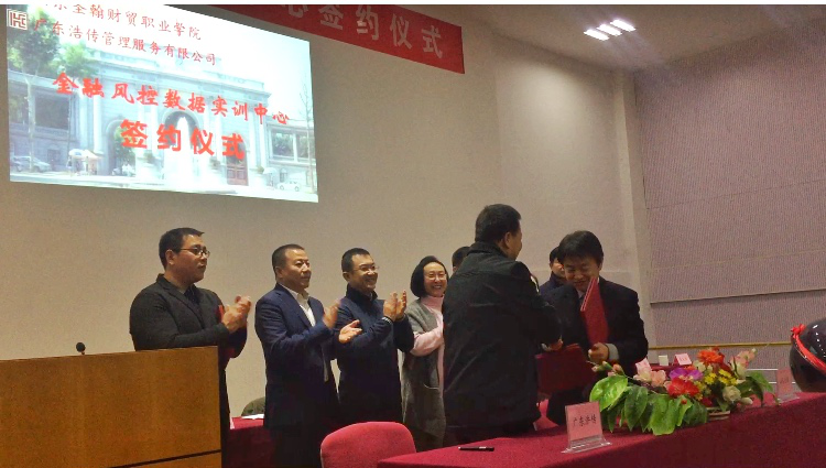2017年12月13日15时,山东圣翰财贸职业学院与广东浩传管理服务有限公司,在山东圣翰财贸职业学院第一报告厅举行金融风控数据实训中心签约仪式。出席签约仪式的有:山东圣翰财贸职业学院校长刘淑云女士、副校长刘波先生、广东浩传管理服务有限公司董事长常戈先生及公司高层领导,财贸学院领导、专职教师、辅导员与金融专业学生。