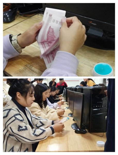 手工点钞是本学期《财经基本技能》课程中一个重要的技能模块,要求学生有规范的指法,标准的坐姿,将拆把、持钞、清点、扎把、盖章等流程顺畅、准确的掌握熟练。手工点钞的标准为手持式单指单张在30秒内清点完毕,数目准确无误。点钞技能的提升,尤其是点钞速度的提高,需要同学们有吃苦耐劳,坚持不懈的韧劲,需要同学们有一直坚持,不放弃的决心。其中,李鑫,孙文瑶、王格格等同学,已具备20秒内点完整把的熟练技能。
