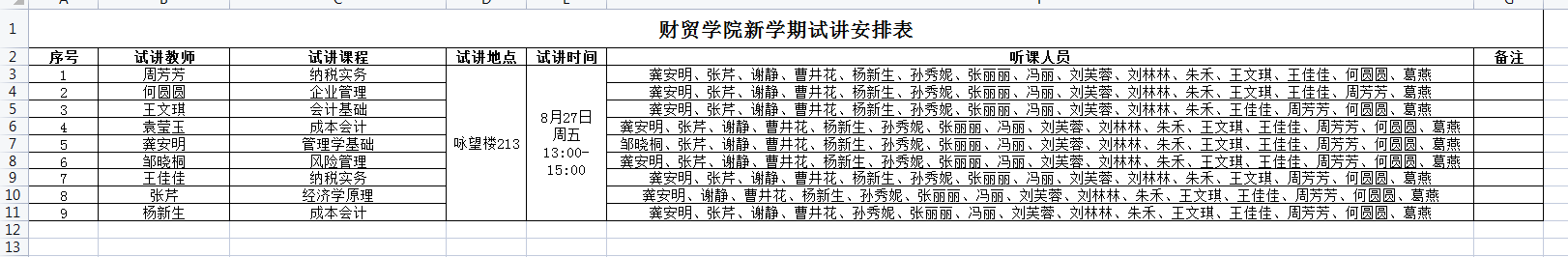 参加此次试讲的共有9位老师,包括专职教师和兼课教师。每位老师制作了精良的课件,设计了合理的板书,以熟练、引人入胜的讲解展现了良好的教学能力。教务处杜敏、赵静老师和财贸学院全体任课教师听取了试讲,并针对每位试讲老师的优缺点进行了点评。