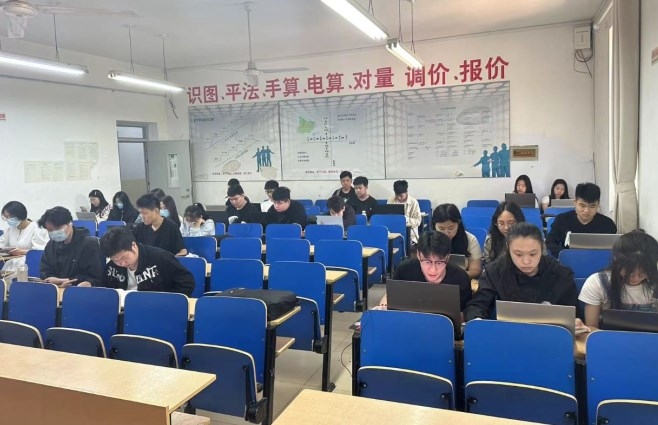 2023年5月12日,第二届全国商业决策大赛的参赛队员正在实训室咏望楼316紧张的训练中。