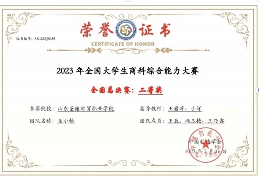 山东圣翰财贸职业学院商学院王辰、冯玉艳和王乃鑫三位同学,奋力通过华北5省选拔赛,成为近1700支参赛队伍中的前122名获得参加全国总决赛的资格。并在全国总决赛阶段与武汉大学、同济大学、西北农科大等多所985、211院校同组对抗,荣获全国大赛总决赛二等奖。