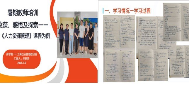 王君萍主任从《暑期教师培训收获、感悟及探索——以《人力资源管理》课程为例》的角度展示了针对本次培训的学习收获、反思与改进。汇报中展示了王君萍主任在4天培训中的28页笔记,条理明晰,详细完整,体现了圣翰教师“打铁还需自身硬”的职业素养,并且带领教研室成员认真反思、梳理总结。