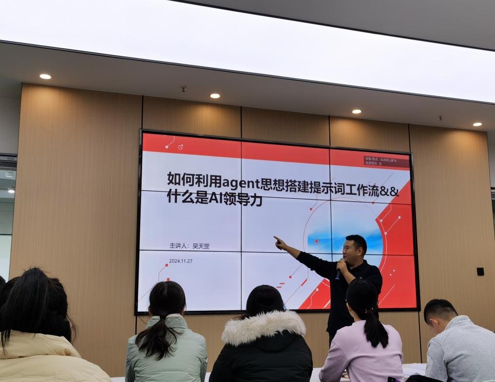 2024年11月27日(星期三),商学院工商管理教研室的老师于创梦空间路演室参加了由学校主办的主题为“利用Agent思想搭建提示词工作流”的专题讲座,本次讲座由知名人工智能专家吴老师主讲,讲座旨在探讨如何将Agent思想应用于教学和科研工作中,提升工作效率和教学质量。