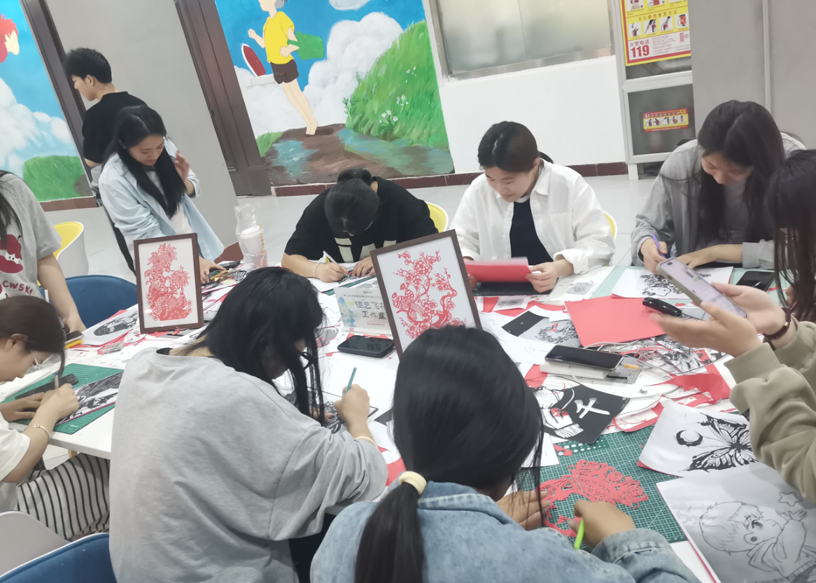 扎染和剪纸活动同样备受青睐。扎染区,学生们将布料折叠、捆扎,再浸入染料中,当布料展开,那独一无二的图案令人惊叹不已,这是传统技艺与创意的碰撞。剪纸区,一张张红纸在学生们手中翻飞,不一会儿,栩栩如生的图案便跃然纸上,从传统的花鸟鱼虫到富有现代感的创意造型,学生们用剪刀剪出了对传统文化的热爱与传承。