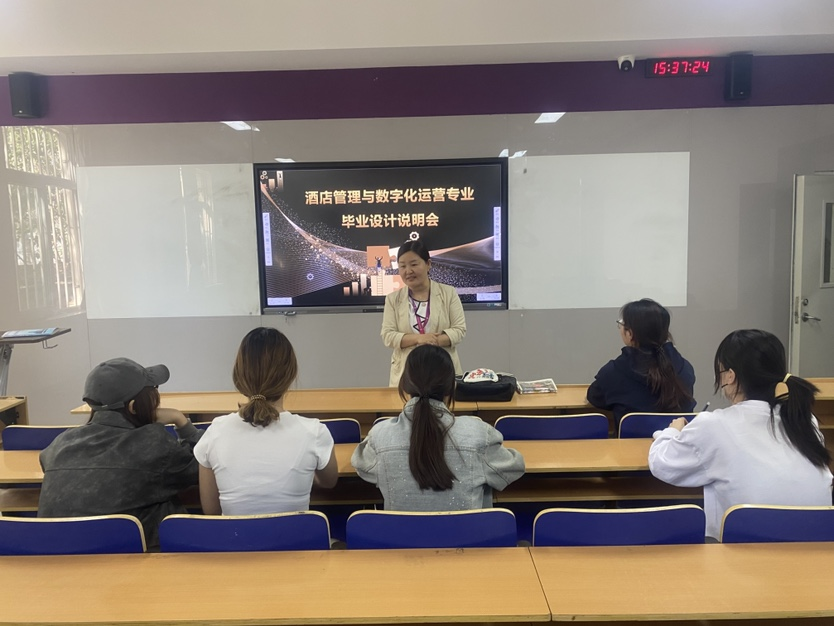 4月24日下午,商学院闫英梅老师在咏望楼202教室为2023级酒店管理与数字化运营专业2班学生开展毕业设计专题说明会,系统讲解实习实践报告的写作规范与评分标准,为毕业生学术成果产出提供专业指导。