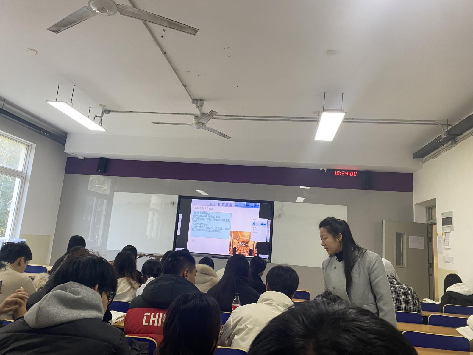 10月21日第三节,咏望楼 203 教室内,2024 级酒店管理与数字化运营 1 班、2 班的同学们正专注投入《前厅服务与数字化运营》课堂,郑小会老师以丰富的教学手段和贴合行业的授课内容,呈现了一堂兼具理论深度与实践价值的专业课程。