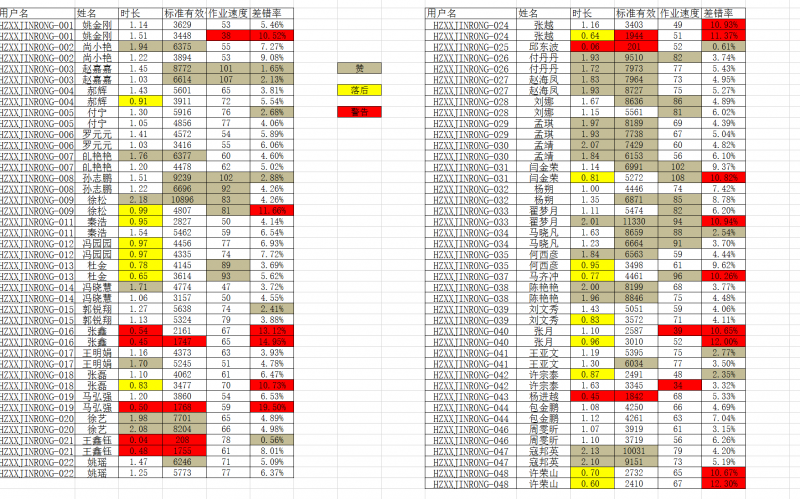 第六周平均差错率5.14%,平均速度66字符/分钟,人均完成字符4534。本周差错率有所上升,整月数据分析整改后大部分同学都有了进步,个别同学依然我行我素,下周想办法继续跟进。