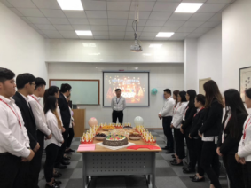 首先公司为10月份生日的寿星们准备了生日蛋糕,不仅有蛋糕,还有各色各样的小零食。然后值班经理常主管代表崔总和公司全体员工,为所有十月份生日的员工送上生日祝福,并亲自为寿星戴上生日帽,并送上庆生红包。紧接着生日会上放起了生日歌,寿星们在生日歌中吹蜡烛,许愿望。最后,常主管与张主管为大家分蛋糕,并与同事们做游戏。