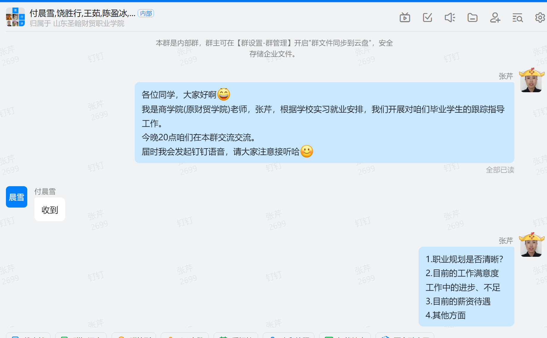 为了解商学院毕业生实习就业的基本情况,进一步加强学生实习跟踪指导工作,及时掌握本专业实习学生的工作表现,更好地了解企业用人需求,开拓就业市场,2023年4月27日对广东浩传管理服务有限公司开展了实习学生的巡查工作,采用线上钉钉会议师生座谈会的方式进行,参会教师有金融教研室主任龚安明、教研室教师张芹、孟雪、宋锦,参会学生有吴瑶瑶、王茹、陈盈冰、于亚琪、付晨雪、饶胜行共计6名。
