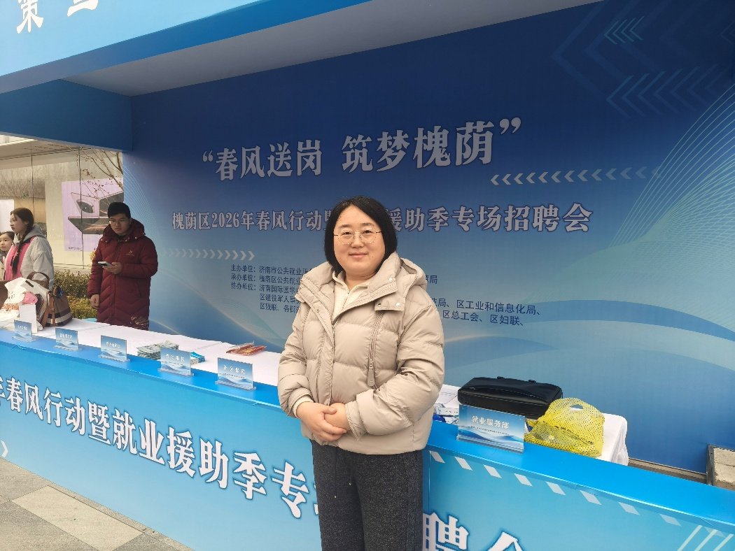 春启新程,职引未来。为深入落实稳就业、保民生工作部署,搭建企业用工与求职者就业的精准对接桥梁,2026年3月14日,“春风送岗筑梦槐荫”槐荫区2026年春风行动暨就业援助季专场招聘会在龙湖济南西城天街广场火热启幕。本次招聘会汇聚百余家优质企业,涵盖智能制造、医养健康、现代服务等多个领域,提供海量优质岗位,商学院负责就业工作的王君萍主任与工商管理教研室专职教师周海玲亲临现场,聚焦工企、旅游、酒店等专业实习生岗位,全力为学生搭建实践与就业衔接的“绿色通道”。