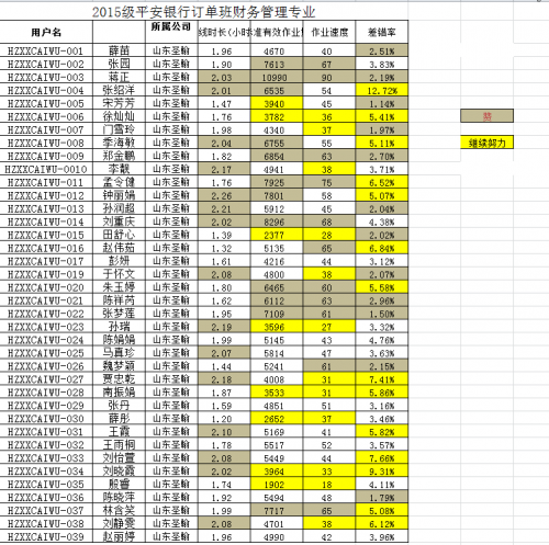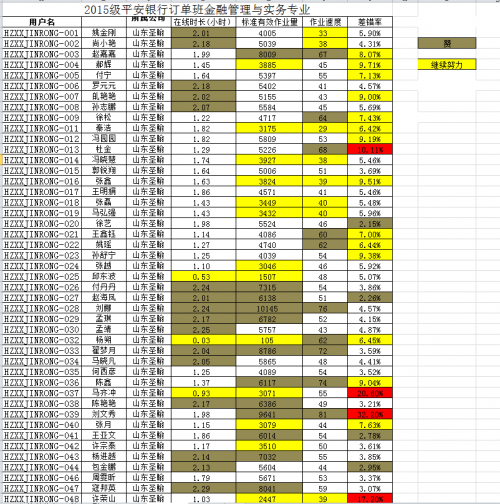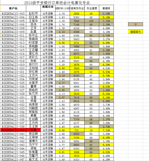 2015级平安银行订单班学生入校后便加入到平安校内实训基地,经过一个学期的刻苦实训练习,同学们的录入技能得到明显提升。本周出现突破性成绩,王丽华同学录入速度突破一百,蒋正、刘娜同学录入量突破一万。本周平均差错率为4.08%,人均录入量4300字符,较上周有很大进步。