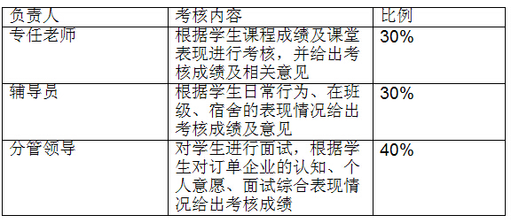订单班在校期间共进行五次考核,大一三次,大二两次。其中前四次为校方考核,最后一次为订单企业考核。考核均实行末位淘汰制,具体时间安排及考核流程如下: