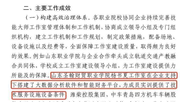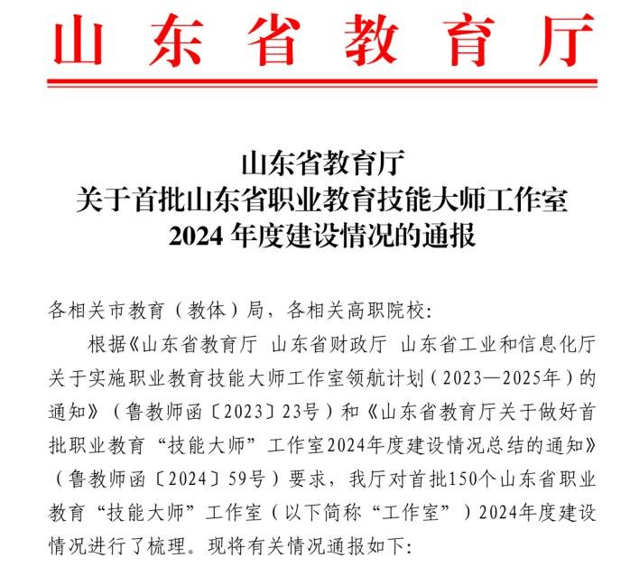 12月4日,山东省教育厅下发《关于首批山东省职业教育技能大师工作室 2024年度建设情况的通报》,“山东圣翰财贸职业学院杨书夏工作室”被评定为“建设成效好”的工作室,是全省唯一一所被评定为“建设成效好”的同类院校。同时,在省教育厅文件正文“主要工作成效”部分,共介绍了全省8所高职院校的工作成效,杨书夏工作室的工作成效被写入其中进行全省介绍,是全省唯一一所受此殊荣的同类院校!