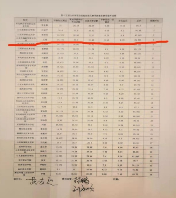 12月23日晚21:18分最终总排名公布,王通最终总分为89.865分,全省排名第四,获得二等奖第一名的好成绩。这个成绩取得了山东圣翰财贸职业学院参加山东省职业院校导游服务大赛以来的最好成绩,取得了历史性突破。学生和指导老师近一年的努力终究没有被辜负,要永远相信一句话:付出就有回报,耕耘就有收获。商学院旅游管理教研室定会再接再厉,争取明年取得更好的成绩。