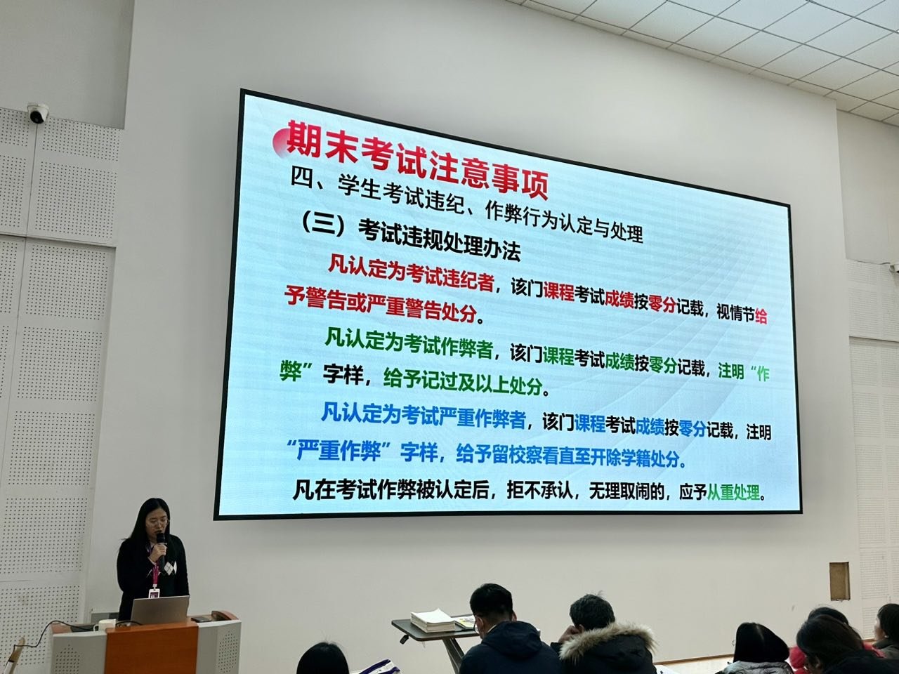 会议伊始,教学秘书张丙英对期末考试管理规定等相关文件进行了详细解读。她强调,考试是检验学生学习成果的重要手段,而诚信则是这一过程中不可或缺的道德基石。张丙英的解读不仅让新生们对考试规则有了清晰的认识,也为他们在即将到来的考试中如何做到诚信应考提供了指导。
