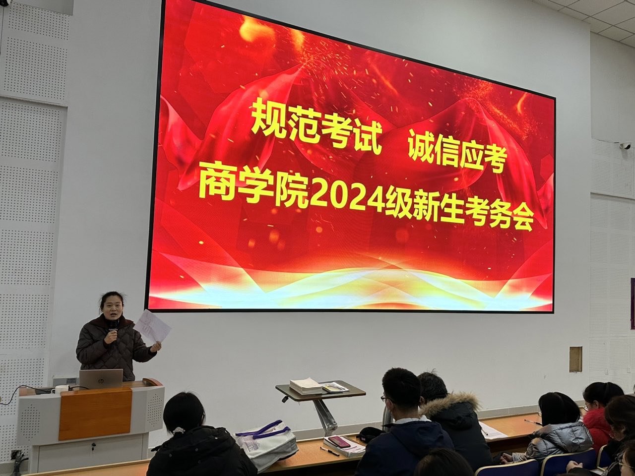 2024年12月16日,山东圣翰财贸职业学院商学院在第五报告厅成功举行了2024级新生考务会。本次会议以“规范考试,诚信应考”为主题,旨在强化学生的诚信意识,营造良好的考试环境,并树立正确的学风。商学院领导、全体专任教师、辅导员老师以及2024级全体新生参加了此次重要会议。会议的召开,不仅是对新生们即将面临的期末考试的一次动员,更是对诚信这一基本道德要求的一次深刻教育。