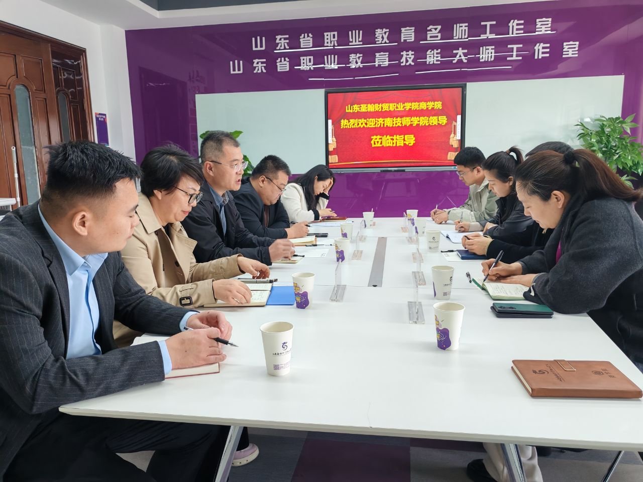 为深化职业教育改革,促进文旅与商科专业交叉融合,2025年4月1日,济南技师学院文化与旅游学院院长李华夏率教学团队赴山东圣翰财贸职业学院商学院,与教务处处长李涛、商学院院长盖晓艳及骨干教师团队开展交流学习,并实地参观了商学院的“融智财务云共享基地”。双方围绕专业建设、人才培养、实习就业、国际合作及实训基地建设等领域展开深入对话,共谋协同发展新篇章。