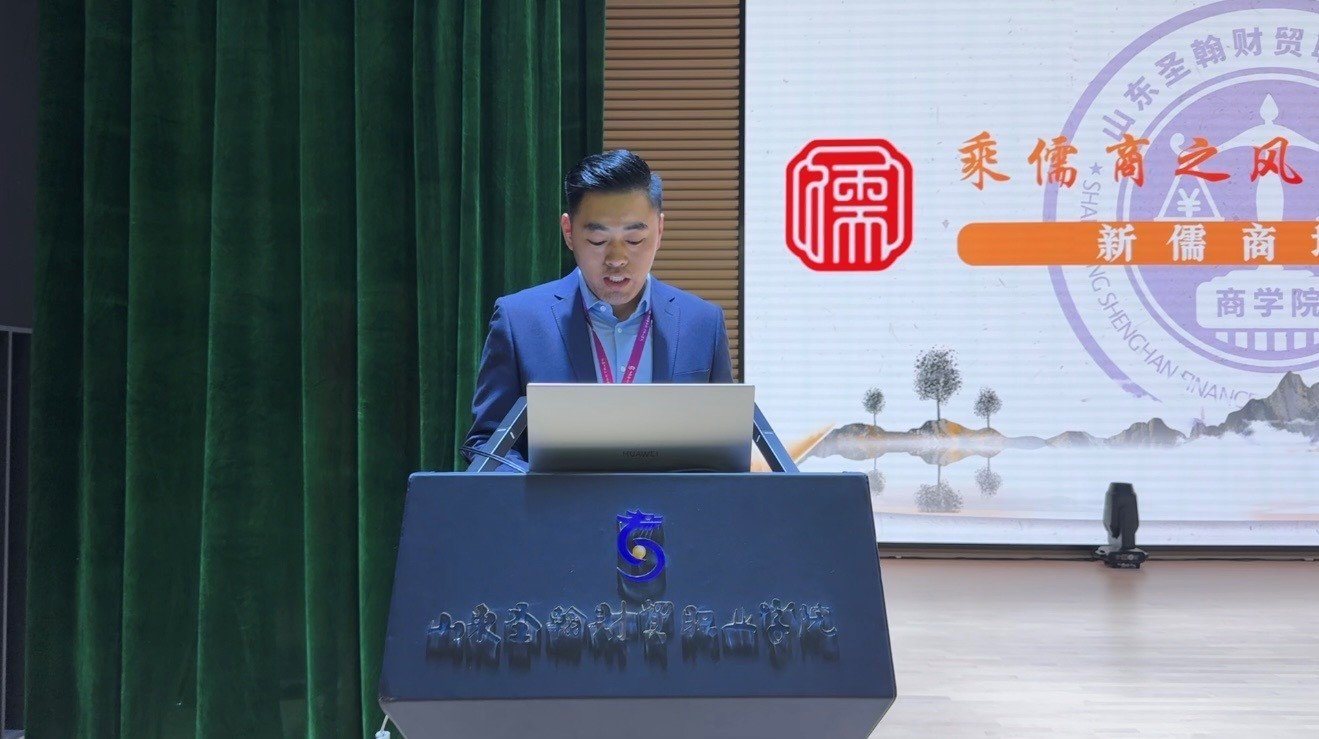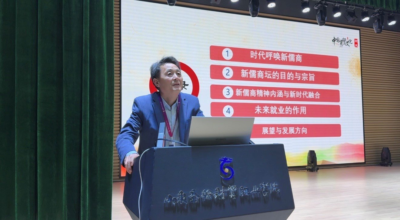 接下来,商学院客座教授贾善耕同志为大家带来了精彩的主旨报告。贾教授在金融领域成就卓越,拥有丰富的实践经验和深刻的行业见解。他在报告中深入探讨了新儒商的内涵与特征,剖析了当前经济形势和商业案例,并分享了新儒商应具备的素质和社会责任。