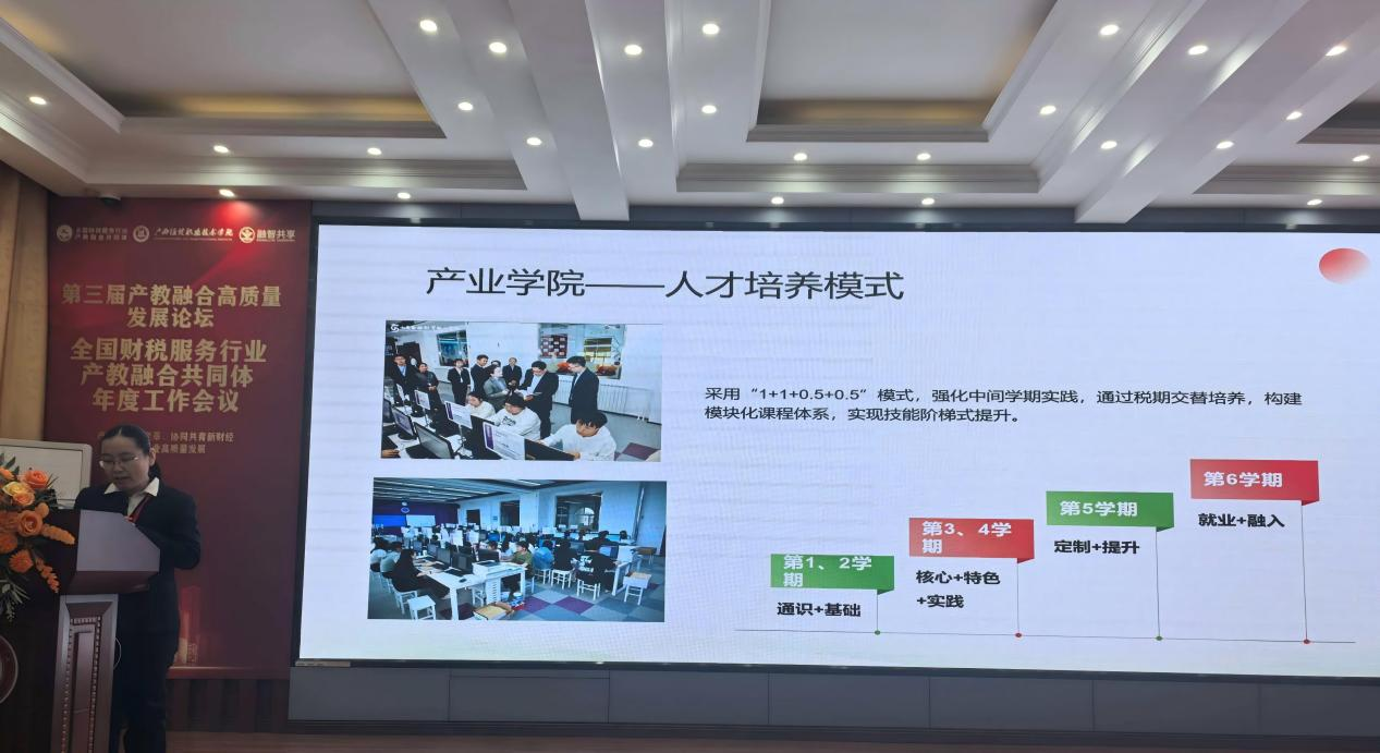 第三届产教融合高质量发展论坛暨全国财税服务行业产教融合共同体年度工作会议于2026年1月9日至11日在广西南宁成功举办,本次论坛汇聚了来自全国553家成员单位的代表。山东圣翰财贸职业学院作为共同体的骨干成员单位,由商学院智慧财经教研室主任谢静在论坛上作题为《高职智慧财经专业群“一院一地一司”产教融合生态体系建设实践》的专题报告,系统分享了学校在深化产教融合、创新育人模式方面的探索与成效,获得了与会嘉宾的高度关注与认可。